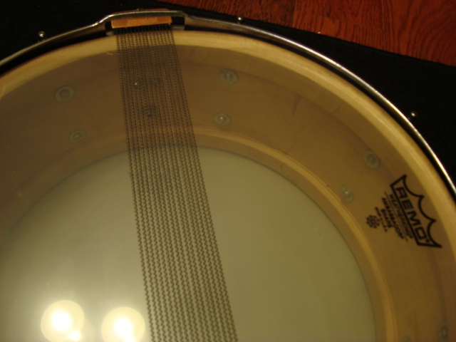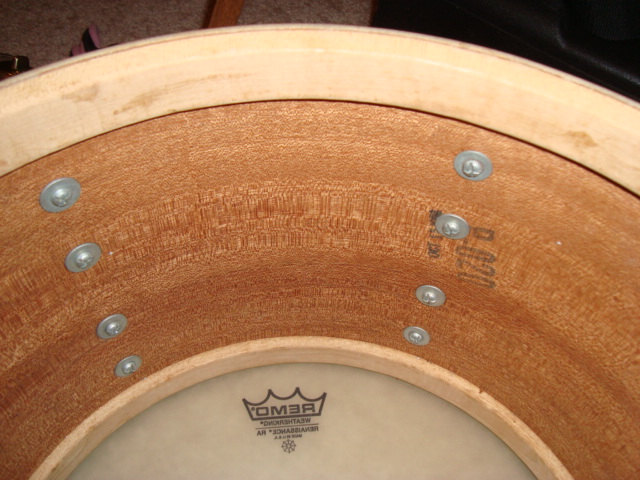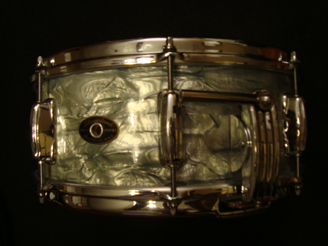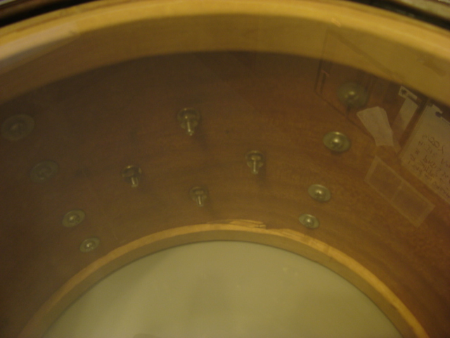 Snare: This is a great sounding snare that tunes up easily and has great snare response. It has great edges and drum heads fit fine. The shell is slightly out of round, however. This one has a Clamshell strainer with Puresound snare wires. Re-ring separation is present but not what I would consider major. The clamshell strainer arm was replaced with a great, stronger, reproduction....the original was broken. The snare bed on this one was widened (but not made deeper) to allow the wires to sit in the center. The snare responds MUCH better and does not choke as quickly. The snare's edges have a light coat of wax to protect and improve tuning.....very nice edges on the snare ;)