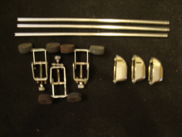 Hardware/Badges: The hardware is in good condition. Everything functions properly, but it needs some cleaning. Some chrome is slightly rubbed off in spots and rust is on the some of the t-rods. The tom mount on the bass has some chrome loss/rust but functions well. All of the hoops are chrome-over-brass originals.