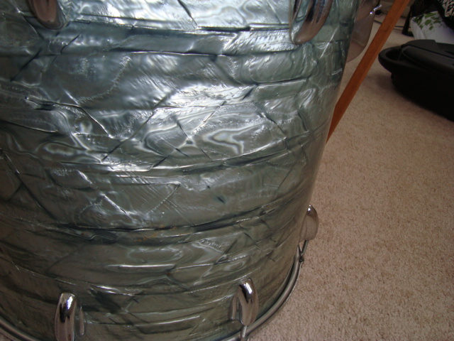 Wrap: The wrap is all original. The wrap has no lift what-so-ever and all of it matches very well for this color. The wrap has faded to a great stormy blue-gray hue depending on the light. It is in great shape on all of the drums except for some slight tom rash on the 13” tom…..does not show up when photographed. Also, I switched out the bass hoops because I intended on restoring the originals. The inlay is in great shape and can be easily reused. The original and extra bass hoops are included.