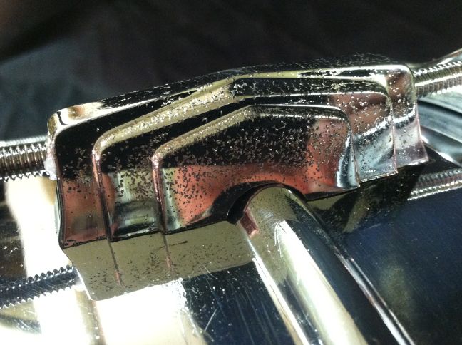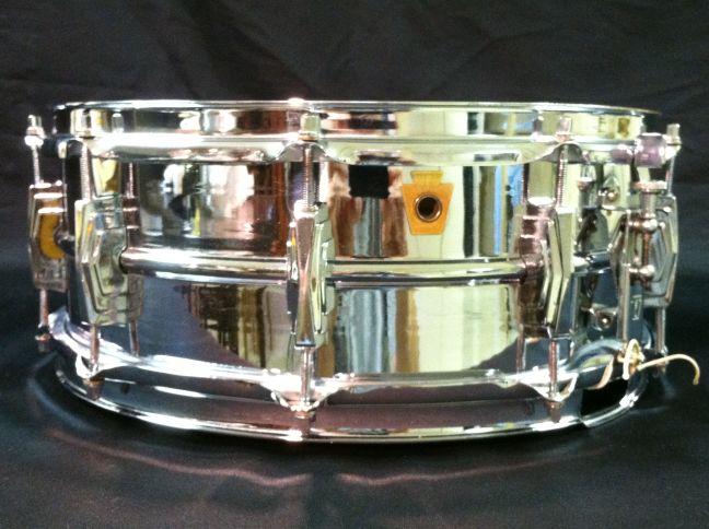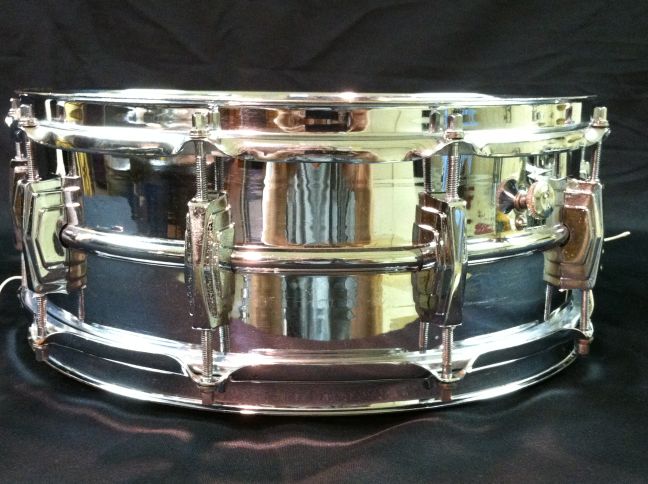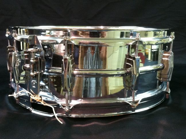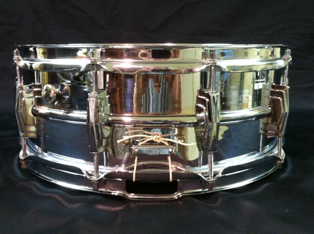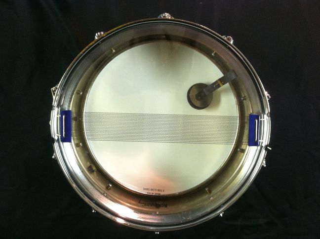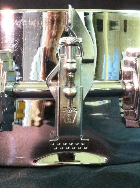 This one is in pretty good condition. All original except for the snare wires and heads. There is some pitting on three lug casings, and some minor chrome loss on both hoops, muffler knob & some tension rods. There is one very small dimple in the shell that is hidden by the top head.