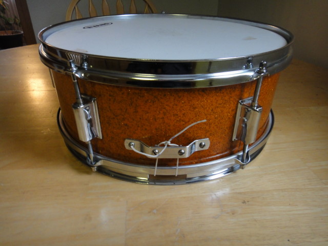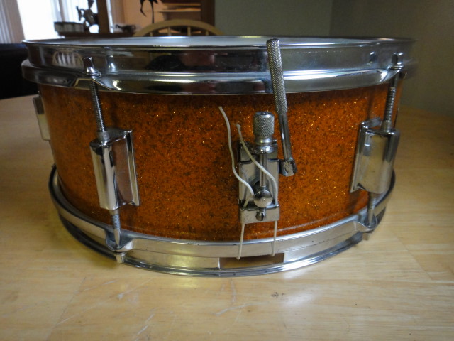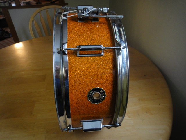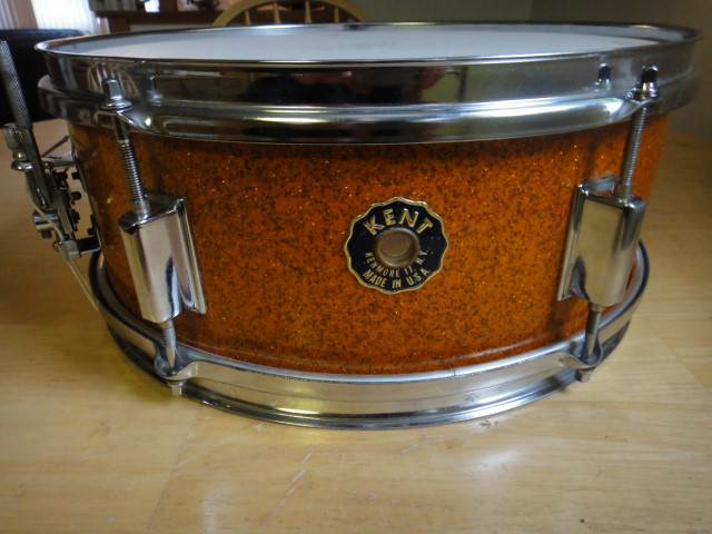 `60s Kent 6 lug 5x14 snare with maple shell and gold sparkle wrap. Wrap looks very good in person, with no fading. Looks orange, but Kent called it gold.