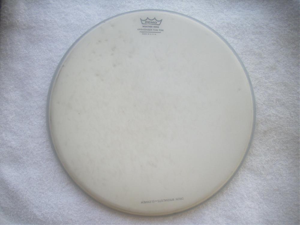 all i have right now is a 12" remo ambassador. looks better than the pic. i would say 90% life left.