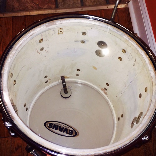 Drum was previously painted over in blue paint which has been removed, leaving some residue at seam and lugs as well as on interior white.