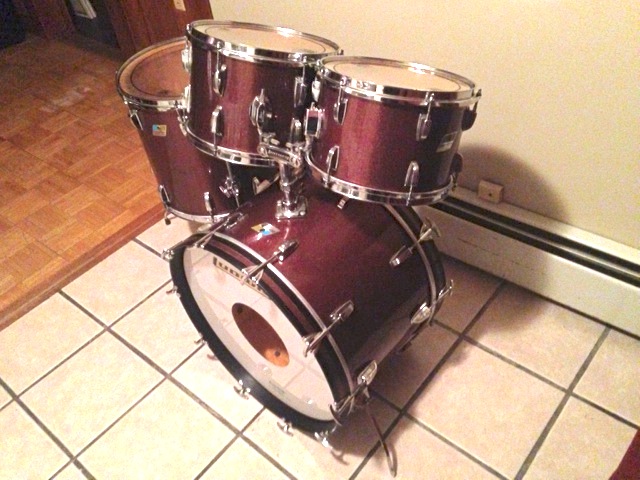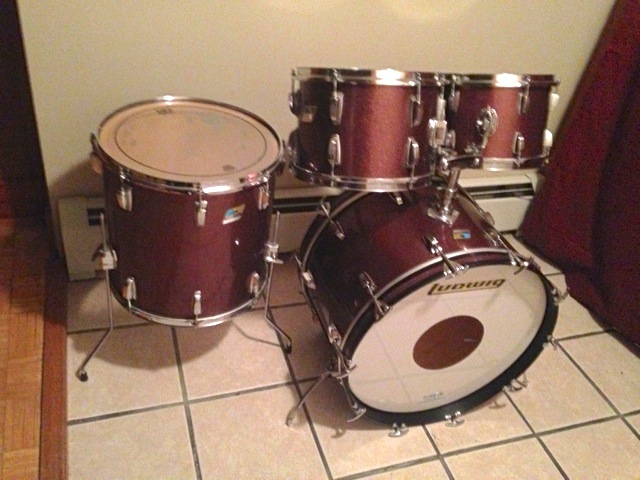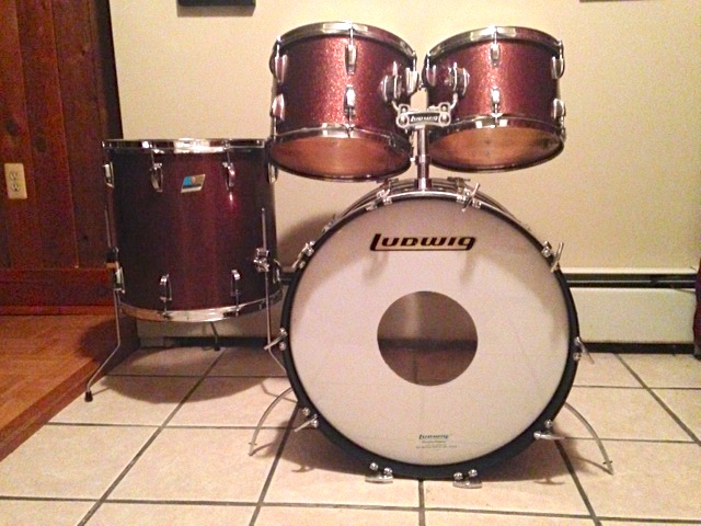 early 70's Ludwig B/O badge Hollywood 4 pc drum set, 2/13/16/22 in Burgundy sparkle finish! just cleaned her all up, retouched the bass drum hoops, threw some broken-in remo pinstripes on and she's ready to play! sounds EXCELLENT in all tuning ranges but excels in mid-tones! all badges are in the 725xxx range.