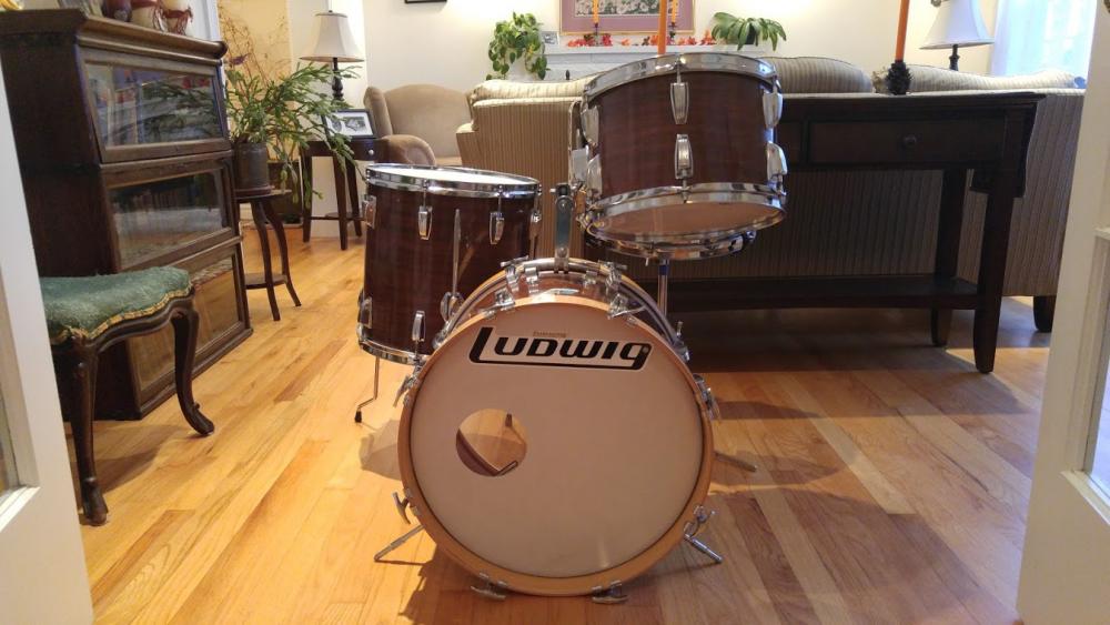 For sale is a hard to find complete mid 70’s Ludwig Jazzette kit, with the rare 12”x18” bass drum and original serial matched Supraphonic snare. The kit is the configuration shown in the 1975 catalog (http://www.vintagedrumguide.com/jazzette.html) right down to the mahogany cortex finish . I obtained the kit from the second owner, who said it has been stored for most of the last 20 years. I do have the hi hat stand and snare stand that came with the kit, but they are in rough shape, and probably not worth shipping. They could be included if a buyer really wants them.