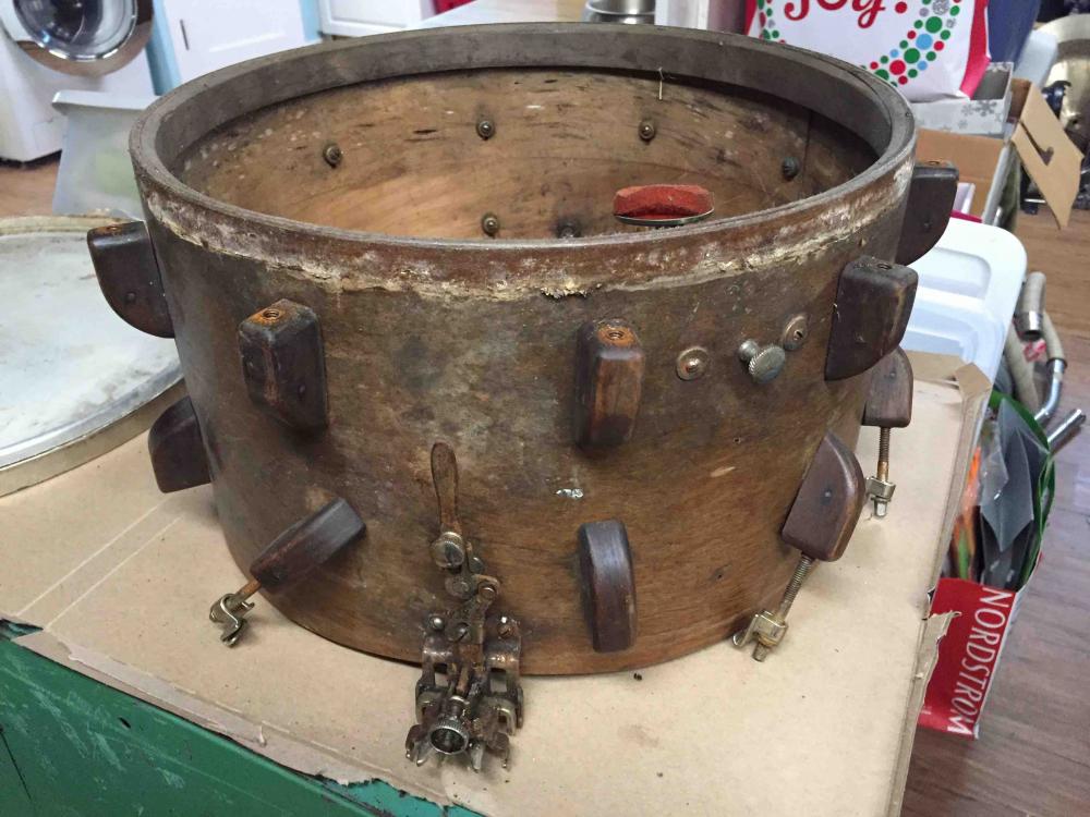 Thank you all for the information. It looks like this shell must have come from a later period than the snare mechanism. With the Slingerland Harold R. Todd style Tone control, the consistent 3" hole spacing on the shell, and the 3-ply shell construction, I began to look at Slingerland as a possible source for the shell.