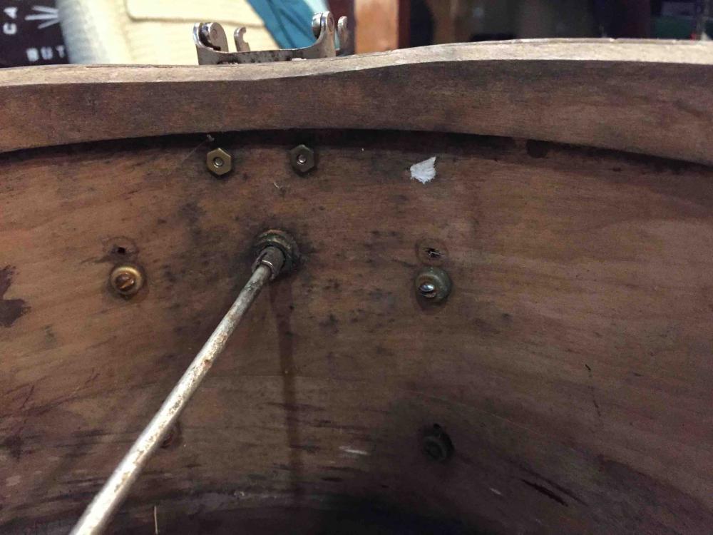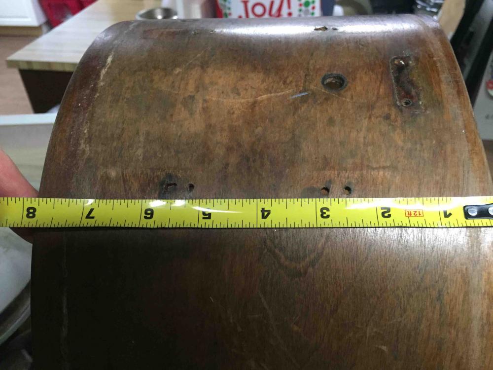 It appears that at some point, the shell was re-drilled for different lugs, and the final iteration I purchased had solid walnut lugs (war time?) with little brass threaded inserts pinned inside to take the tension rods. These lugs were only mounted to the shell with a single wood screw. The backs of these solid lugs are also solid with only a single mounting hole for the wood screw. The most accurately spaced holes are 2.5" from each bearing edge which would make a tube lug that is 3" between mounting holes. The holes at 2 3/4" from the bearing edges show high variation in both directions enough that I think they were drilled later. Perhaps the wood lugs were added to help cover the old holes.