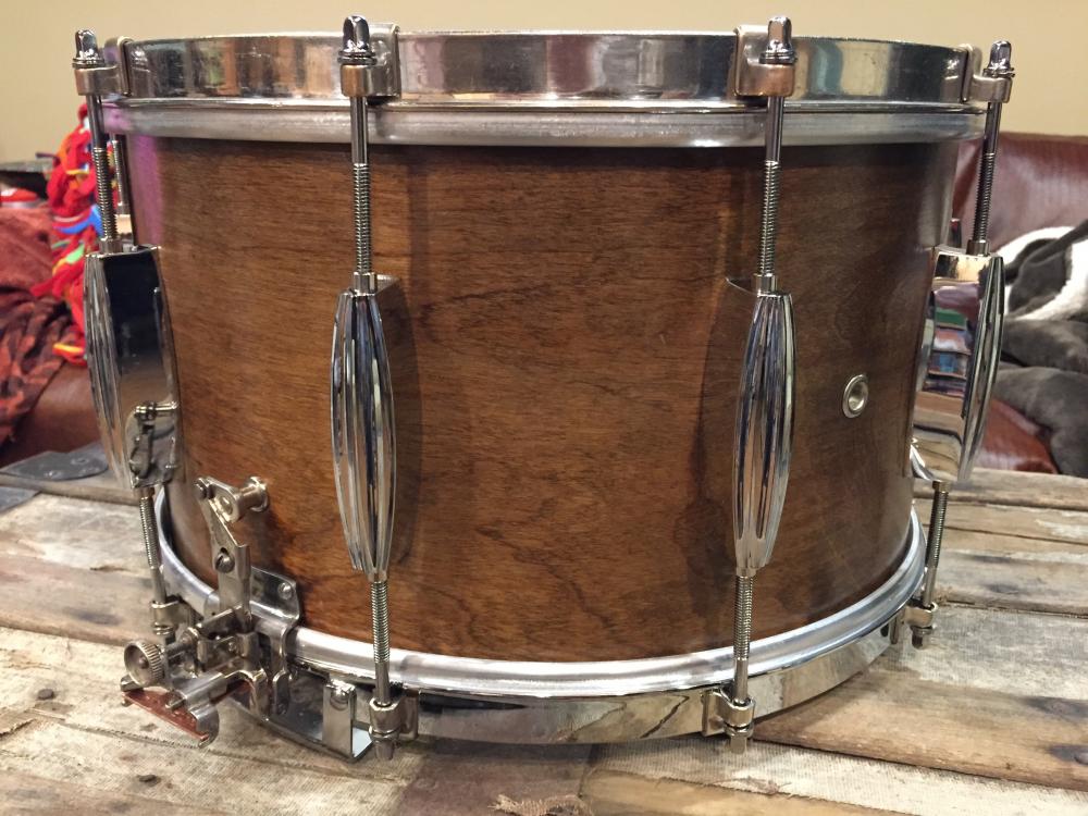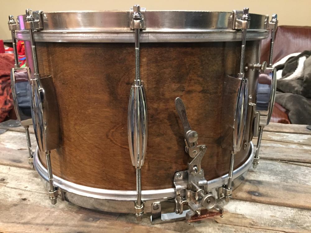 Thank you for your help in this project. Here is the Rat Rod Drum after restoration: Slingerland streamlined lugs with 3" on center hole mounts to match original holes in shell. The wood shell is still unidentified but thought to be 1940s based on when 8x14" drums began to show up in catalogs. The wood was cleaned with soap and water, buffed with "0000" steel wool, and treated with about 5 applications of Formby's Tung oil finish (contains varnish) with buffing in between. It was not sanded because I wanted to preserve the aged wood surface.