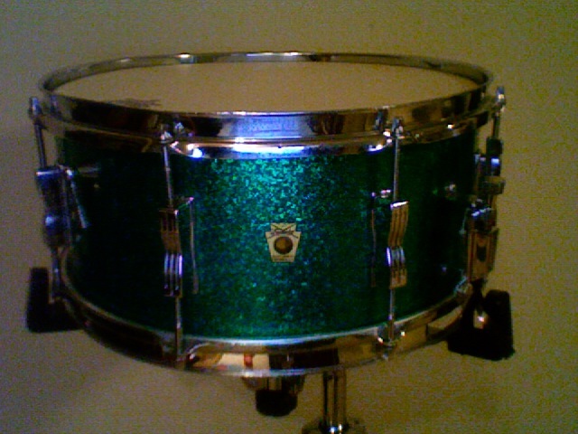 The next one is a Ludwig Auditorium in original green sparkle. It's not faded much, if at all (probably a little, but I can't tell). It has a pre-serial badge (1960-63), a red felt baseball bat muffler, white interior, eight bowtie lug casings...the works. It's in GREAT shape and sounds AWESOME!!!