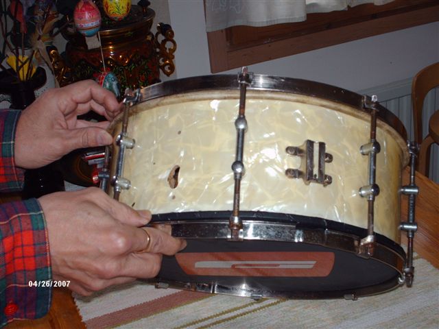 A friend of mine has gotten hold of this snare drum with no badges or other means of identification. Can anyone out there identify this drum.. or at least guess its approx age? I haven't seen the thing yet, just this photo, so I can't tell how many plys it has etc. There's a badge on the side of it saying: "GPL Trommeln-pauken, Gustav Ponschardt, Leipzig C1", presumably put there by a German dealership. It may be European... then again some fellow drummers at DFO figure it might be US made. The WMP wrap seems to be in reasonable state, the strainer's gone.