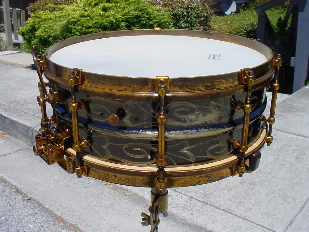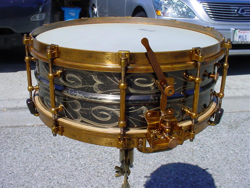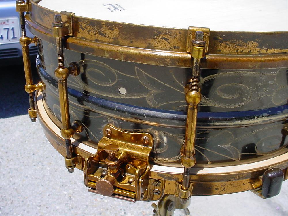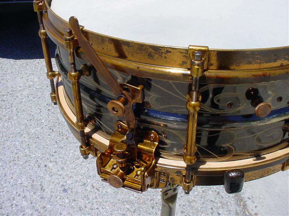 Well, one of my “Holy Grail” snare drums was finally located and has entered the Curotto Collection. This is the only one that I have ever seen or heard of. The only reference that I am aware of is on page 4 of the 1934 Slingerland Drum Company catalog. The DUALL “RADIO” MODEL All Metal Drum was offered in a “5 x 14 or 6.5 x 14 shell depth, chromium or nickel plate finish, engraved black metal shell with chromium fittings or engraved black metal shell with Art Gold fittings.” The drum that I was fortunate to locate is catalog No. 43, "engraved black metal shell with Art Gold fittings". This drum was found on a shelf in a middle school art classroom. The seller’s girlfriend alerted the seller who then made the deal with the school. The seller had originally contacted my good friend and fellow collector Steve Maxwell who then contacted me. Steve was gracious enough to allow me to contact the seller personally and the rest is history. So special thanks goes out to Steve Maxwell, to the seller Steven Gouty, to Mark Cooper (more on Mark later) and to Dave Brown of the UK who was cheering me on all the way through this deal. A final twist to this story is the fact that only three weeks earlier at the 2013 Chicago Vintage Show, Mark Cooper, Dave Brown and I were all wishing out loud how cool it would be if an engraved/Art Gold DUALL showed up at The Chicago Show!
