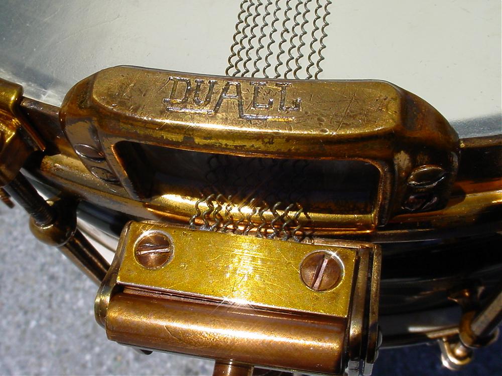 3. The DUALL mechanism on this metal drum is different from the wood DUALLs that I own (and have seen) in that there is no internal connecting rod running across the diameter of the shell. The DUALL mechanism simply engages/disengages the wires from the lever side but not as much from the butt side. This has become a mystery for me (and some friends) as we have tried to figure out how the DUALL mechanism on this drum differs (works) from the wood shell DUALL Models. You can clearly see at the butt plate side that there is no upper linkage but only the lower external DUALL mechanism. The hole above the butt side mechanism does not line up with that mechanism so this tells me that it is the factory air hole which is in the exact same place as my nickel plated 10 lug Artist Model of the same era (see photo). What I need here is an example of a DUALL “RADIO” MODEL All Metal Drum so I can physically see what's going on. I am asking anyone out there that has this model to please contact me.