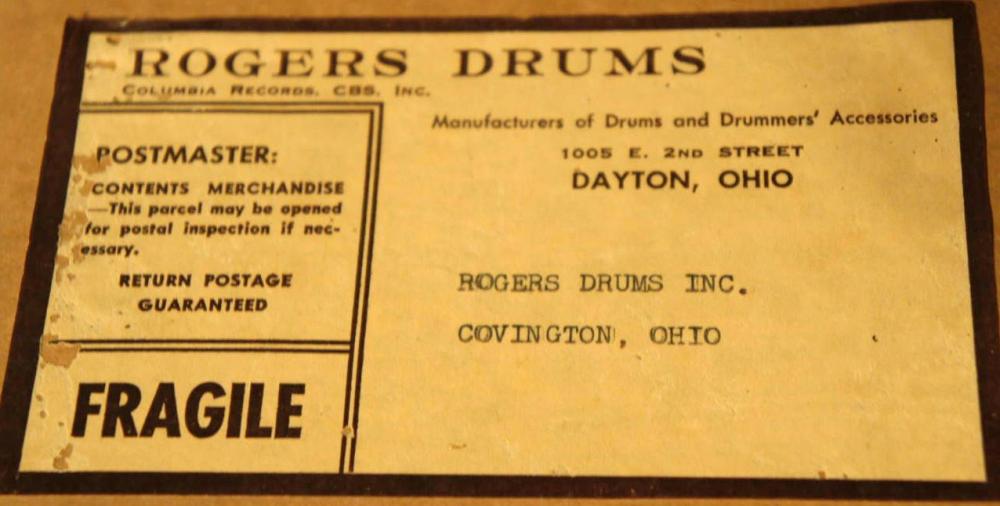 These drums were bought by the parents of the recipient, the son, who was given these drums for Christmas, 1966. His name is written in pen on the hardware box(I will withhold for privacy), and the last name is on one of the other boxes. Incredibly, there is still a small piece of the white and gold wrapping paper on the pedal box, and inside the floor tom box. Some 1-1/2 years later, he left for the service and went on to Vietnam where he served and came back to be a postal worker for 28 years. Sadly, he passed away this past July at the age of 64 in Troy, Ohio. The Original boxes are quite special, as they show that they had been delivered(not shipped due to proximity) to Thompson & Etter Music directly from the Rogers Dayton plant. Each drum box is date stamped: