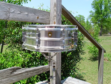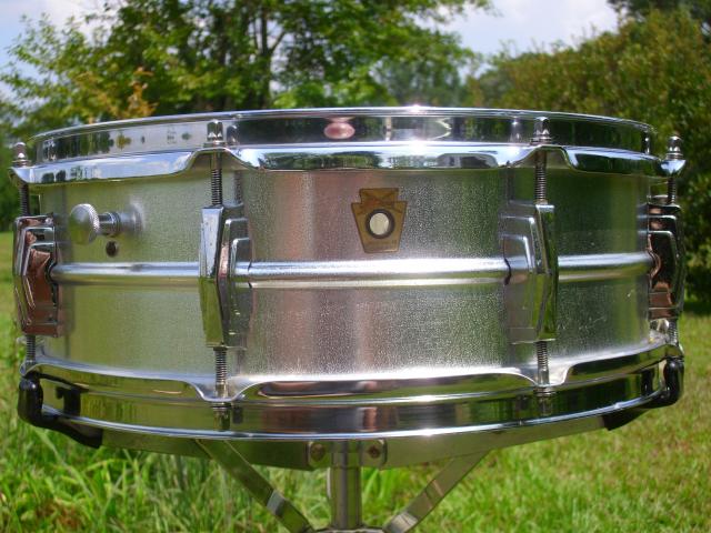 There are several theories concerning the one with the imperial lugs. Based on marks on the shell, these appear to have been original to the drum. The only other two that i have seen with imperial lugs also had the small round knob muffler like this one does. The round knob mufflers were present prior to the red felt baseball bat mufflers. The bowtie lug with the recess in the back had to be designed for the new Acrolite drum. These may be the first Acrolites based on the imperials and the muffler. The imperial lug with the recess was already in production being used on the Ludwig Super 400 and Supraphonics. when this drum came to me, it had an aluminum snare side hoop and was missing the top hoop. I added conventional Acrolite hoops in chrome to match the chrome imperial lugs. This also makes the drum much more playable as the aluminum hoops bend easily. It has been said that many of the aluminum hoop models were sent back to Ludwig for conventional hoop replacement or possibly that Ludwig simply mailed the dealer new hoops. I cannot verify either one of those however.