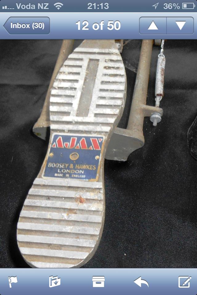 Today, at a flea market, I obtained an AJAX, Boosey and Hawkes foot pedal in fair condition. I know nothing of this brand. Maybe jonnistix (the best as far as I'm concerned) can help. If any member needs this piece of hardware, let me know.Brian