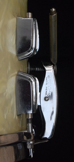 This is the first iteration of the clamshell. Before the year was out, Slingerland had redesigned the brackets holding the throw and butt to the shell.