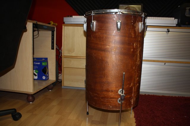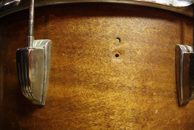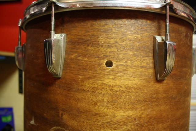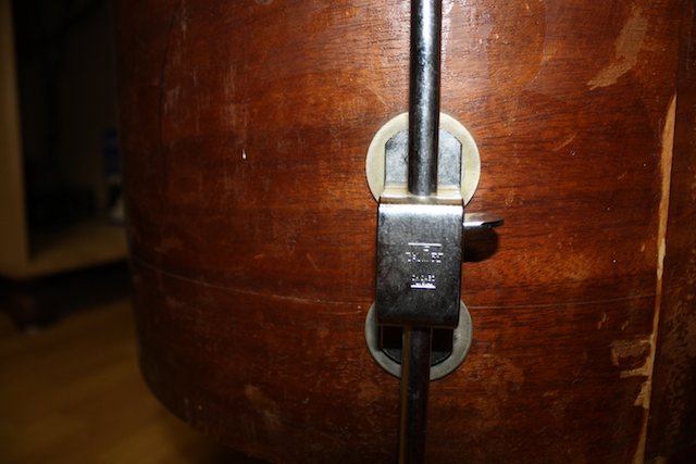 Got a few questions on this guy and any help is always appreciated. What I have (I think) is a 55 ish WFL Cocktail Lounge Drum. I don't think it has any extra holes but it is missing the badge and Tone/Snare mechanism. My guess is someone was going to re-wrap this sucker and then decided against it. That would explain the missing parts and the legs being put on with the washers on the outside of the drum. It does have what appears to be the original lugs, WFL tom holders and legs.