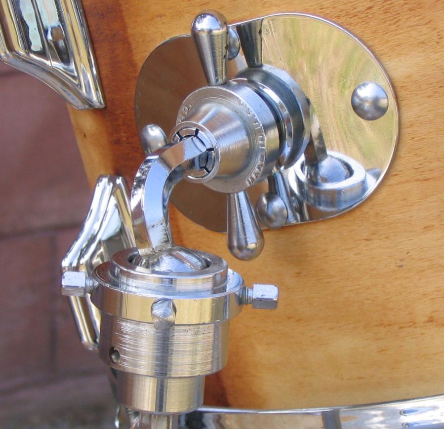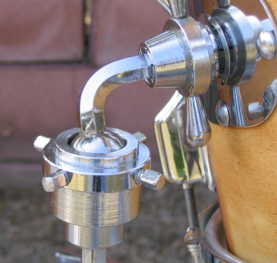 I'm also attaching some pictures of a vintage Rogers kit I had some years back, clearly showing the machined nose around the collet fingers, securely clamped around the hex shaft of both the tom arm and bass drum spur. You can see how little of the collet fingers are exposed at the opening of the nose. This is what you want to achieve!