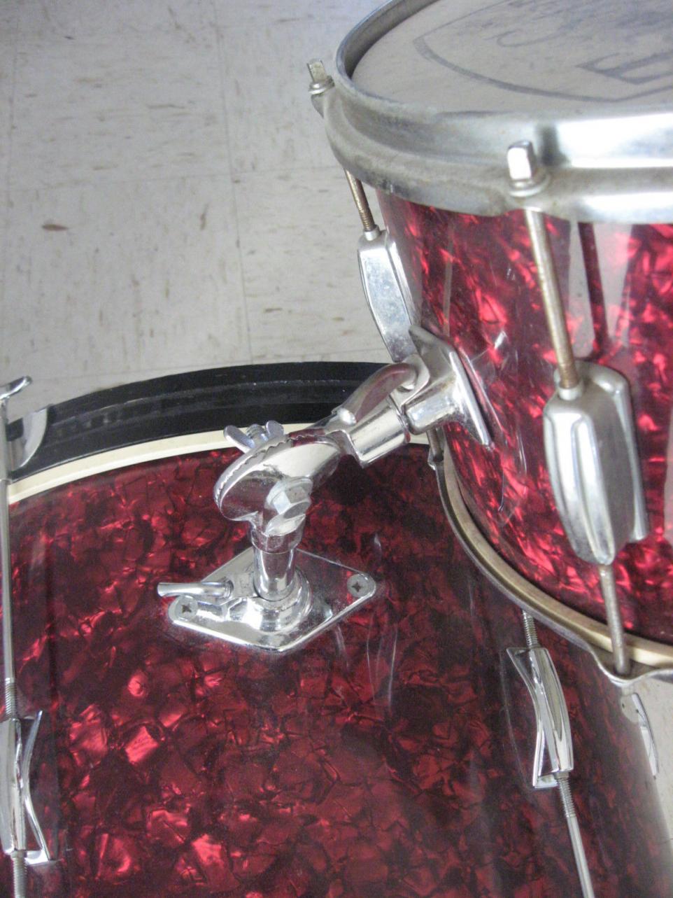 The wrap is fairly uncommon. Also, this is one of the very few, if not only, MIJ "Club Date" style kit that I have seen that actually has a matching, single lug floor tom! I like the unusual cymbal mounting bracket, and check out how big that logo is on the heads! This is a very cool score for someone, and I'm sure it's 3 ply with re-rings, which always sound great! All the parts are there, except for an eyebolt on one floor tom leg bracket, and the batter bass hoop is missing the inlay. Dig. I would go for this myself, but I am about 7 hours from Harrisburg.