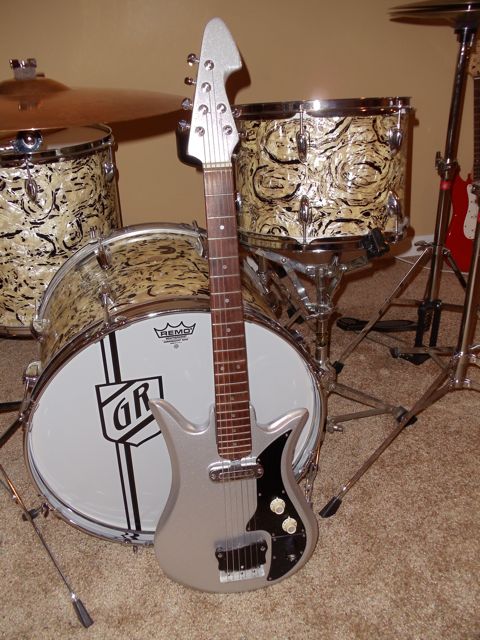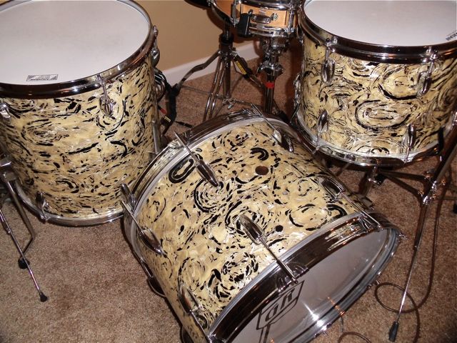 Ignore the guitar....I got these three shells for $50. No badges or lugs or rims. They were in really poor shape but I found all the original lugs, got new rims, patched some holes....it came out nice. Although I bought them together, I think the rack tom is a slightly different pattern, having a more whispy swirl in a consistent pattern. The bass and floor are a perfect match with a more broken up, random pattern.