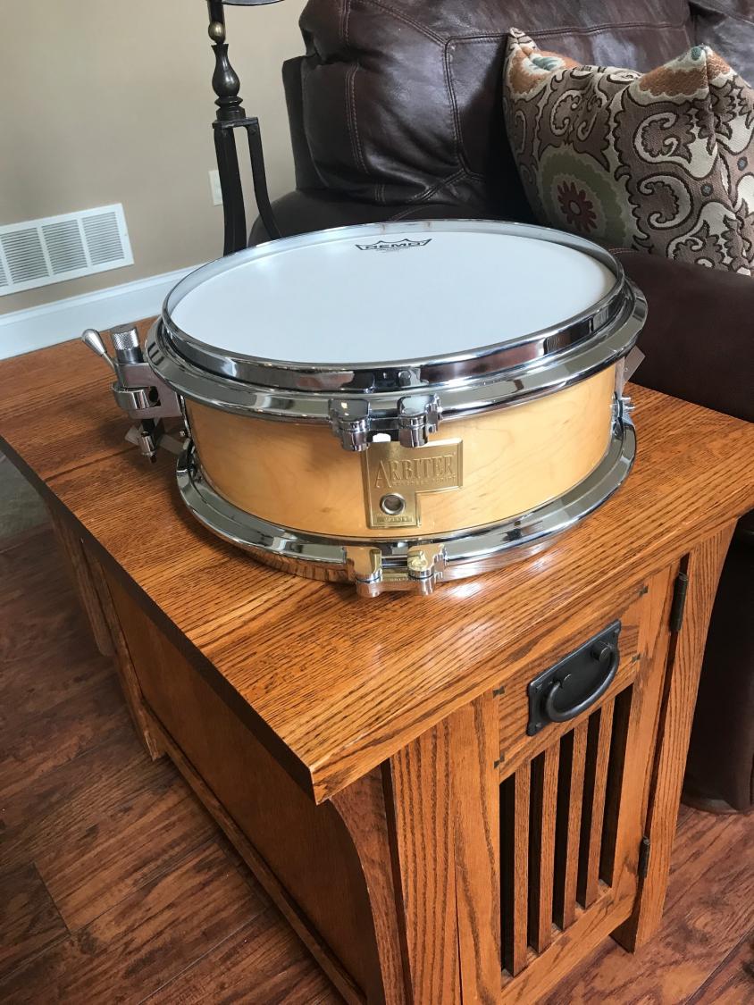 I am not professional arbiter, nor am I an Arbiter drum expert, but think your snare might have been part of a portable, all pancake depth kit Arbiter made called "Flats" I think. I have a late 90's Arbiter AT (Advanced Tuning) snare that has the same halo hoop hardware as yours. It's more of traditional snare depth 12x5, but it tunes up great and sounds super. Mine didn't have the original strainer on it when I got it, but I found a Trick 3 position that fit without modification. I would like to see a pic of the strainer side on yours, I would guess mine would have been the same.