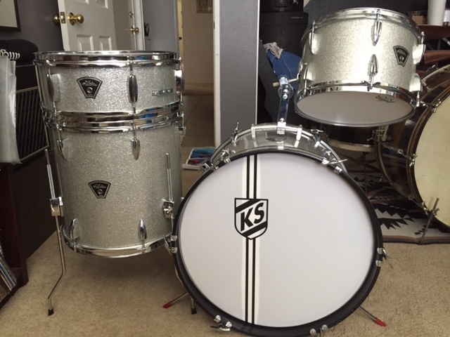 I saw them in my neighbor's garage and I inquired about them. It turns out they belonged to his daughter-in-law's father who passed away fairly recently. He's been sitting on them, but wanted to fix them up and give them back to her. Since I love vintage drums, I offered to do the work for him and we were both pleased with the end results. We added the father's initials on it as a tribute to him. Hope you guys dig this kit as much as I do. By the way...these things are in really nice shape, with no extra holes or customizations and that 6-lug snare sounded surprisingly good!