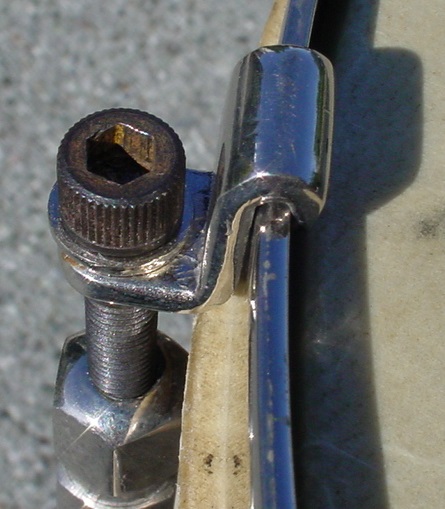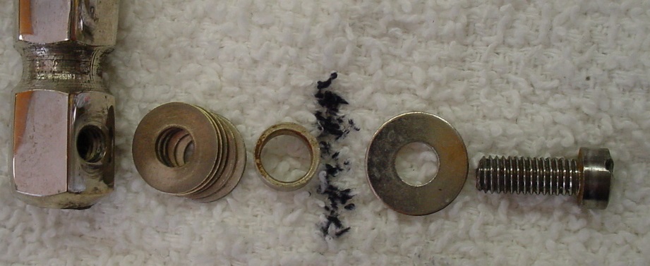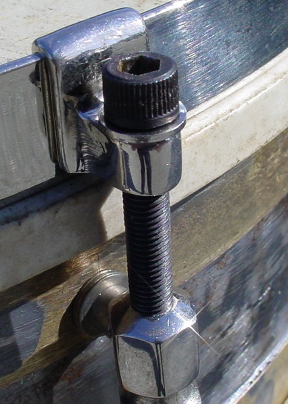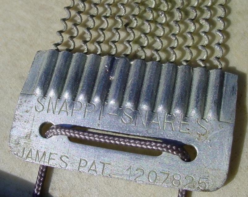 The nickel plating was in excellent-plus condition and looked to be more heavily plated than usual so all that was needed was a wipe down with a clean cloth. The 12 steel lugs are of a design that I’ve never seen before. The lugs are attached to the shell in a very unique way: starting from inside, we see the same type of 8-32 attachment screws that are used on Slingerland Radio King Models: moving to the outside, the attachment continues with 4 brass washers and a type of “spacer” that finally threads into the lugs. The tension rods used on this drum are 1/4 – 28 *Allen Head Bolts that are much heartier than the 12-24 threaded tension rods that are normally seen on a drum from this era. The Ludwig & Ludwig stamped top rim and the bottom rim are the steel band type used on early Universal Models and as stated the nickel plating is in excellent-plus condition, especially for steel rims of that era. The top 12 collar hooks are different from the bottom 12 collar hooks. The P-338 strainer has the wrong threaded part but it works fine so I decided to just leave it as is. The butt plated was installed upside down but I left that as is also as it goes with the theme of this strange snare drum. Both the P-338 and the butt plate have been bolstered with the use of the aforementioned Slingerland 8-32 attachment screws/nuts vs. the 4-40 attachment screws/nuts that would normally be seen on a drum from this era.