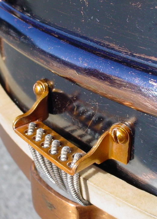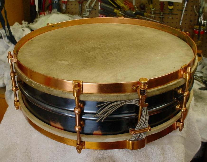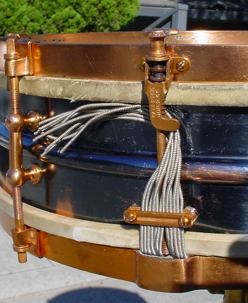 Of-the-era top and bottom calf heads and wire wound snares rounded off this restoration. Stringing single strands of gut or wire snares is my least favorite part of collecting and restoring vintage snare drums, it is a real chore...it’s like having to play Feelings, Wipe Out and the Hawaiian Wedding Song. Hats off to the snare drummers of yesteryear who had to deal with changing snares.