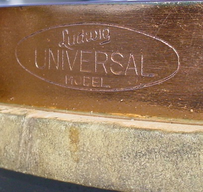 This shell is a 2-pc. brass shell with folded over and soldered back bearing edges but a lighter version as mentioned. The Universal rims are the “steel band” type rims vs. the nob single flanged rims found on the Professional Models. The top rim has the oval “Ludwig Universal Model” stamp. The Universal Model came with the top rim-mounted Tango Throw-Off Strainer (1922-53) and the P-84 “basket” butt plate vs. the P-338 strainer and P-85 butt plate that came with the Professional Models.