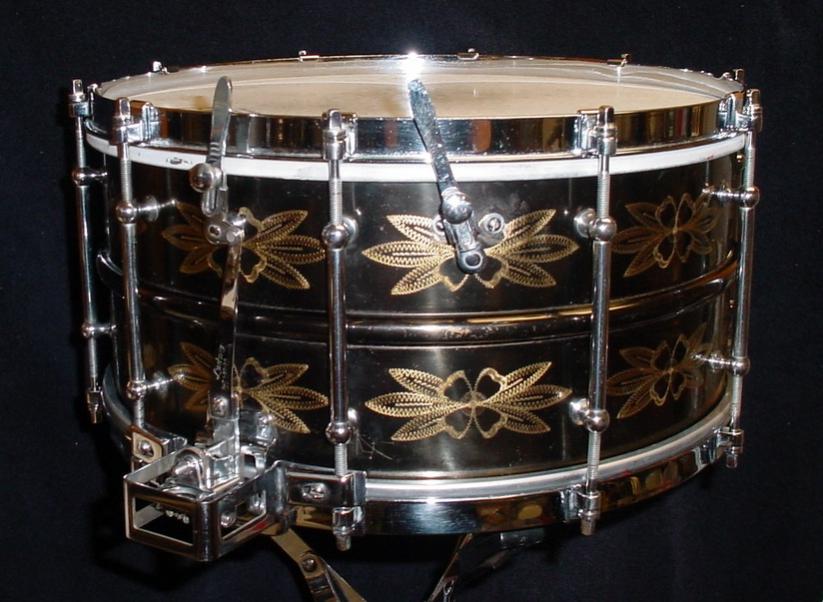 Bill told me to pick out three drums and I couldn’t believe my good luck. I decided on the Tom Mills metal snare drum that started the Ludwig Drum Company, the gold plated and engraved snare known as the William S. Hart Triumphal and this 6.5 x 14 Black Beauty with the letters D.F.S. engraved on the shell.