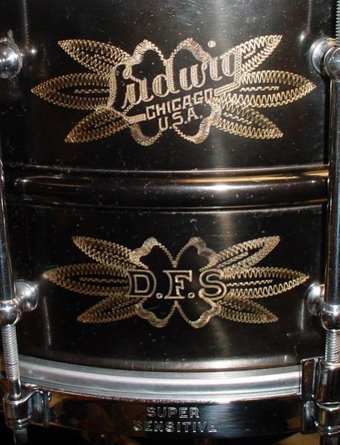 A Ludwig employee of the 1920s with the initials D.F.S. asked the engravers to personalize this drum for him. Wm. F. Ludwig Sr. found out and made it clear that he was upset that the production line had been slowed down by this special request. The employee was allowed to keep the drum. He was not a drummer and he simply put the drum in storage rather than using it. At some point the drum was presented to Wm. F. Ludwig II. WFL II played the drum for a number of years and eventually sold it to Harry Cangany in the 1980s. The ownership/provenance of this drum is very clear; the first owner being the Ludwig employee (Mr. D.F.S.), the second owner WFL II, the third owner Harry Cangany and on March 29, 2018 I became the fourth owner of the D.F.S. drum.
