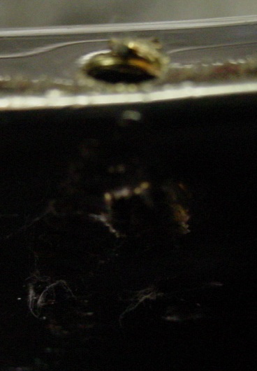 The previous owner had already polished the shell so I just cleaned it up a bit. The nob shell is in very good shape with no major dings or dents...kind of... There were two extra holes in the shell that looks like they were started (very crudely) near the edge of the shell and then through the bearing edge. I have no idea why this was done as these two holes are as useless as a **** in a punch bowl. Drainage from wet applied calf heads? I think not as there are already two openings internally on the fold-over that would more than handle any “drainage”. Fortunately the holes are not visible. The previous owner disclosed this to me before I purchased the drum so all is good.