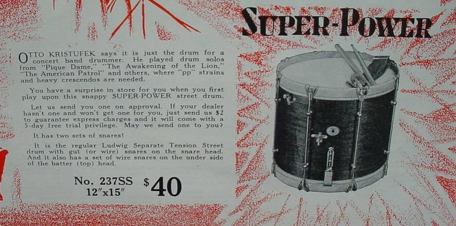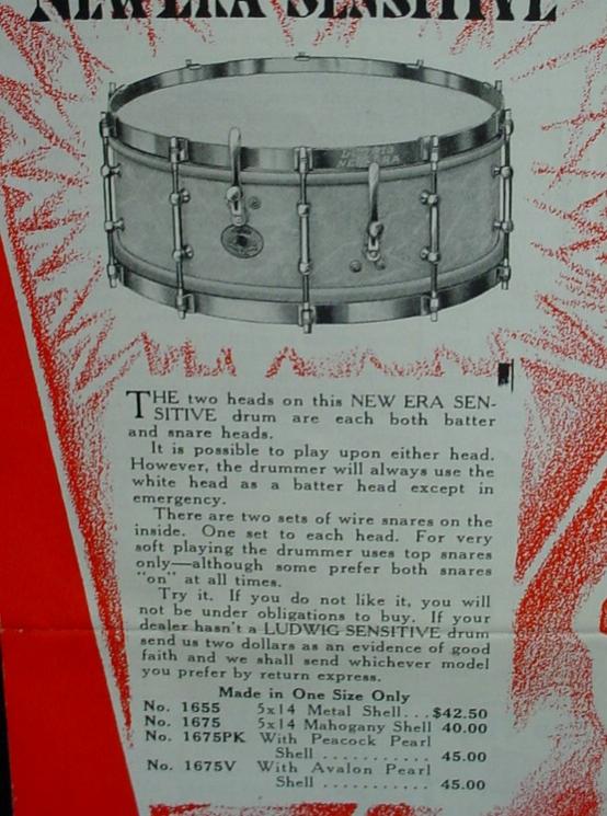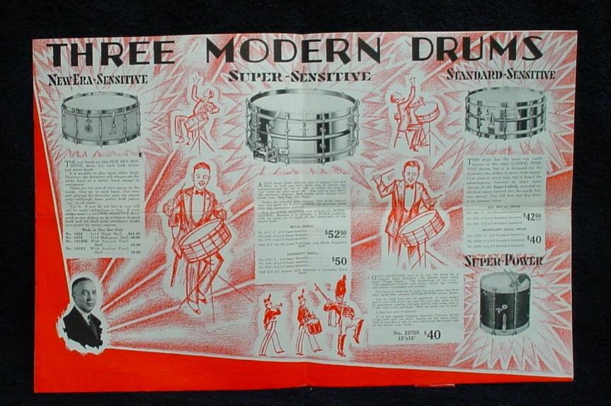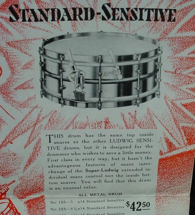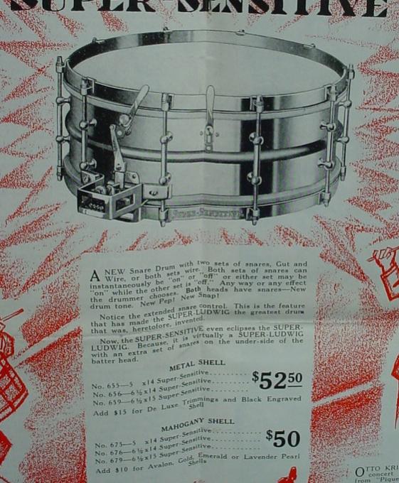 In 1929 Ludwig & Ludwig offered four new snare drum models that can be found in the Fall 1929 Ludwig Drummer Magazine. The new models were the Super-Sensitive, New Era-Sensitive, Super-Power and the Standard-Sensitive Model, the drum in this article. From what I have researched it looks like the Super-Sensitive Model was around from 1929 through 1936, whereas the New Era-Sensitive, Super-Power and Standard-Sensitive Models only lasted for 1-2 years (1929-30). Super-Sensitive Models are very collectible and somewhat rare in certain instances but the other three Sensitive Models are extremely rare and in my opinion highly collectible.