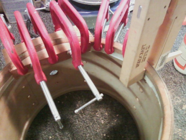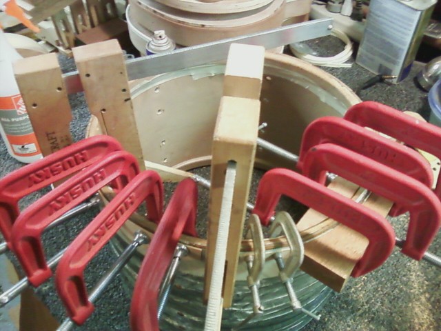 2) After that dries (I'd let it go overnight), mix up a small portion of Rock Hard Water Putty (available at just about any hardware store) and fill in the dings and gouges in the bearing edge, forming the putty as close to the form of the edge as possible. The gouges look rough enough (from the pictures) to hold the putty fine (the putty is kinda like paint -- it won't stick to smooth surfaces real well, so the gouges will need a little "texture."). Wipe away all excess putty. (BTW -- Evidently, Slingerland used a process similar this this right at the factory, as I've had Slingerland drums show up here that had putty-type of patches on bearing edges. Quite frankly this experience with older Slingys is what gave me the idea to do this in the first place!!)