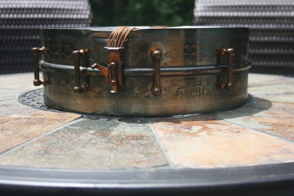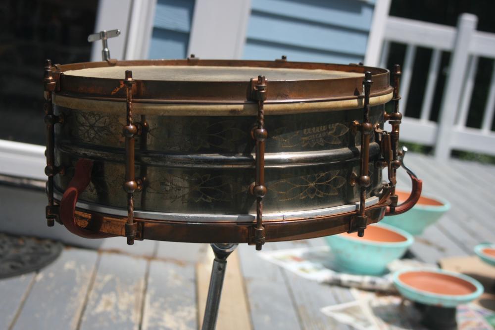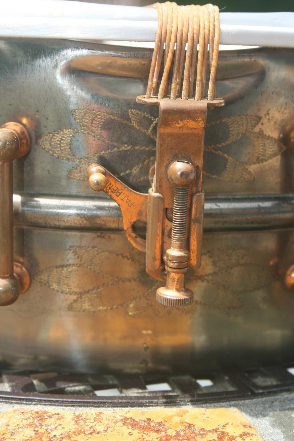 Its a barn find, very dirty.. I didnt find it but the seller got it at an estate sale and it shared a drum case with a fury friend. The original drummer owner played it his whole life. Its a players drum . Im just looking to clean it up . The pics here are after a light cleaning with a damp cloth . Three of the brass claws were damaged , One of the tube lugs has a small crack in a bulb . The black nickel plating is warn to about a 1/3 of the drum. Snares look good . Clutch works , the pics make the dents look worse than they are due to the reflections .. I am going to go to the 2nd clean up with soap and water to get some of the inbedded dirt off of it . No buffing or chemicals though .. bit of wd40 in the lugs and snare throw .