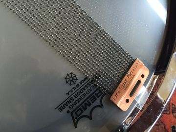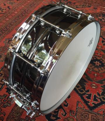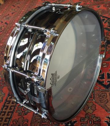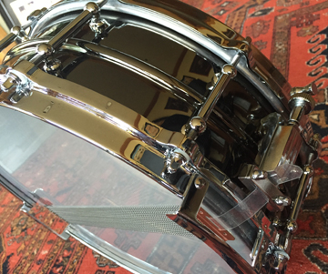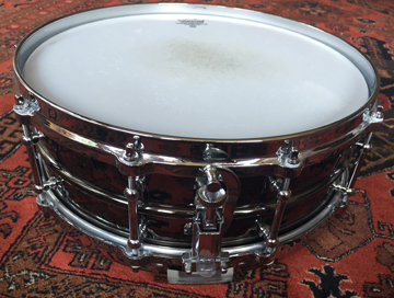 For sale - The Black Dawg 5x14: highly rated, contemporary replica of the 1920s era, unengraved Ludwig Black Beauty. Beautiful, black anodized nickel plated 1.2mm brass shell with center bead and rolled bearing edge. Single flanged, chromed, die cast hoops with 10 chromed brass tube lugs. Vented, P-85 style strainer and butt piece. Puresound snare wires. Coated Ambassador batter head and clear Ambassador on snare side.