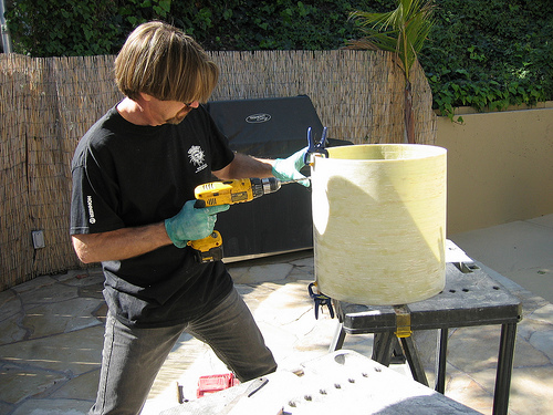 Okay guys, I've been holding out long enough over here. A friend of mine by the name of Jerry Jenkins helped me build a one of a kind drum set using Blaemire fiberglass shells. He specializes in restoring these shells which were made famous by Hal Baine and his "Monster kit". Jerry acquired a huge lot of shells and I was able to purchase 7x10, 8x12, 9x13 toms, 16x16 floor tom, and 6.5x14 snare drum shells, all virgin. There was no bass drum shell available, so I picked up a 14x24 6ply Ludwig bass drum, and stripped it, then re-wrapped to match the kit. All the Blaemire shells had a red wrap on them that we stripped off. These shells were initially made for a guy named Andy Florio, but he never ended up bulding the kit, and passed away quite awhile ago. His name is actually tagged in several of the shells. After the stripping of red wrap, Jerry and I had quite a bit of sanding to do, to get the glue off, and smooth them out. I was going to try and finish them in their raw green finish, but the shells were not consistent in color, so a wrap was in order. The snare would remain in it's raw finish though. Jerry did all the drilling and wrapping, and I had most of the Ludwig hardware that would be used, I did have to purchase the hardware for the 10" tom and the snare. Here are a few pics along the way, and the final pic is at a gig I did this past weekend. Obviously, I owe Jerry many thanks for helping me put this one of a kind kit together. More pics next page.