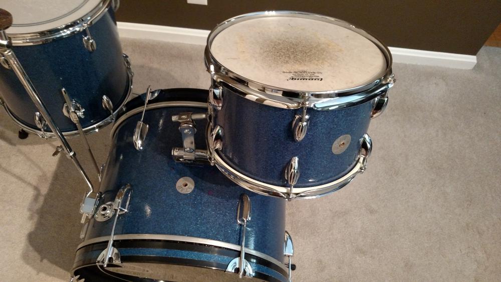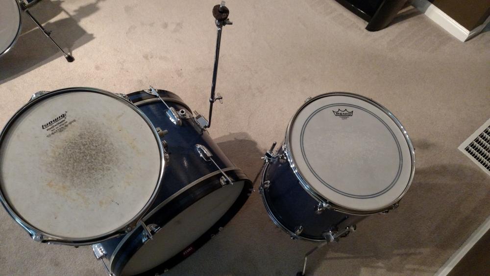 1. The previous owner had installed a different tom mount. I filled in the holes with wood filler and covered the large (1") mounting hole with a piece of wrap that I had saved from the snare that went this kit (it was trashed, but I saved it for lugs and wrap). It blends in perfectly. I had an extra rail mount that matched up exactly with the original holes (that were never filled in). I took a blue sharpie to the smaller screw mounting holes of the old mount, and you can barely tell they were there at all. Also, it appears there was a second Ludwig bracket mounted on the bass drum at one point (for a cymbal L-arm). I filled in the holes and used the Blue Sharpie trick again. Again, barely noticeable. It has the original cymbal holder mounted to the bass drum shell, so I just left it there. There is no eyebolt, so it's "blank" inside. Obviously, there is also a Ludwig bracket and MIJ cymbal arm on the shell as well that functions perfectly, even though it appears the horizontal part of the "L" was cut a bit shorter (again, by the numbskull previous owner!) Bass drum hoops are plastic, but are in good shape with inlays intact.