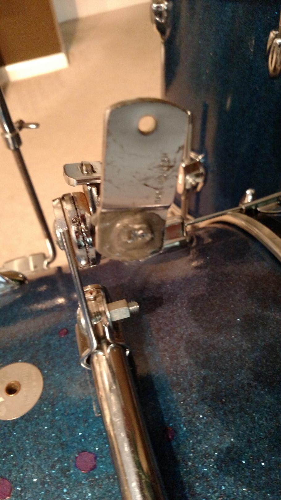 2. I also had an original tom clip bracket laying around, and again it matched up perfectly into the existing holes on the rack tom, which were not filled in. I covered the other mounting holes and used the Blue Sharpie trick again. The biggest hole is covered by the bracket, the rest are again, just barely visible.