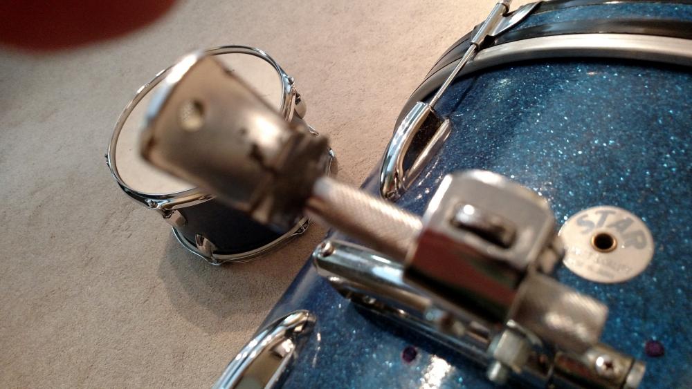 4. The "thumb" mount that the rack tom goes on was very loose and sloppy with lots of play. I used some JB Weld and now it is as tight as can be! There is some JB Weld residue on both sides of the "thumb", but it is barely noticeable, and completely hidden when the tom is mounted. The floor tom leg brackets were stripped and cracked, so I replaced them all with new Ludwig brackets. The hole pattern lined up perfectly, so no extra holes were drilled! New floor tom legs too (the originals are too darn short!)