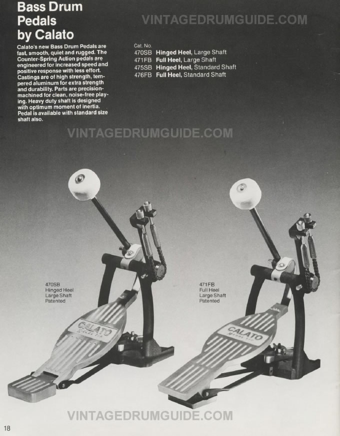 Invented by Joe Calato along with his son Joe Calato. Has several patents on it, from the '70,s but it wasn't a seller.Really good pedal. There's a big religious/cult thing around drum pedals ---how else can you explain the success of speed kings? A very hard market to break into unless you can slap a famous name on it for the devotees to wank over.---- Also invented the nylon tip drumstick in the '50,s. The Calatos are the owners of Direct Music which distruibute about 25 major percussion brands including Noble &Cooley and DW. They make Regal Tip and have the distribution rights for Remo in Canada out of Niagara Falls N.Y. Super people to deal with.