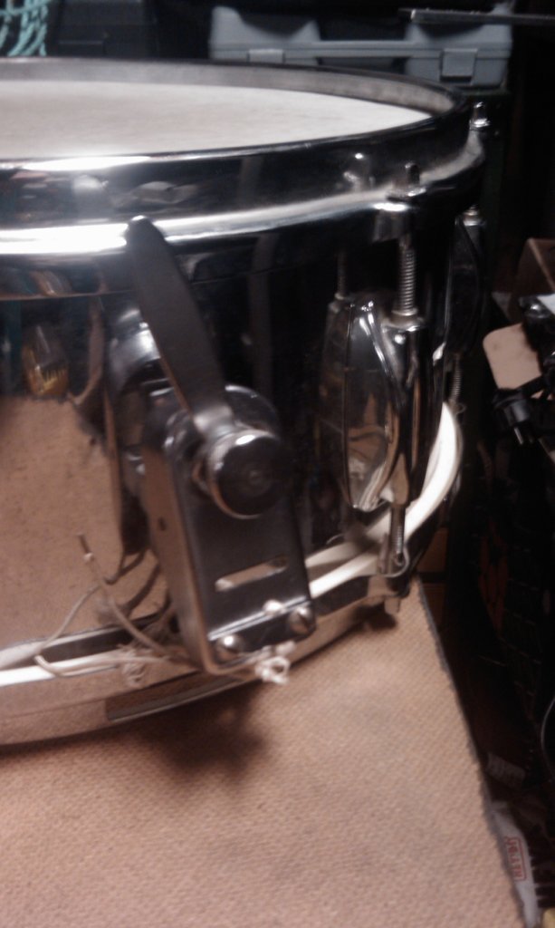The hoops, however, I think are very possibly aftermarket. I have a few examples of 60s MIJ Stick-saver copy hoops and none that I've seen have the protruding holes for the t-rods like these do. I dont think that they were original to this drum.