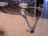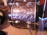 I had to shrink them down quite a bit to get them to post. If you notice, the bass drum leg is not the original. I replaced the original with a set of Gibralter bass drum supports. The simple "slide out" one's would not hold the bass in place at all. I used to use these in a Rock-A-Billy band that I used to play with and set it up as a stand up kit. I used the bass and the floor tom and I inverted the floor tom and mounted it on the cymbal stand so it would be high enough and not too top heavy for the mount. I used my '58 WFL snare with it. It is covered in White Marine Pearl and it looked great with this set up.