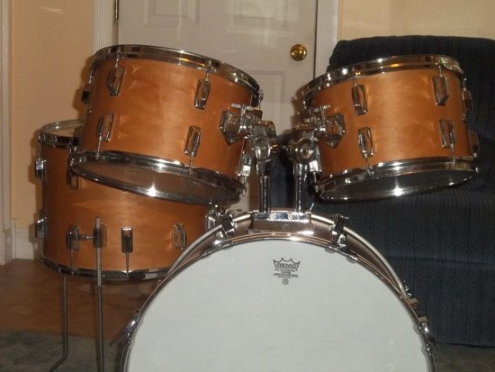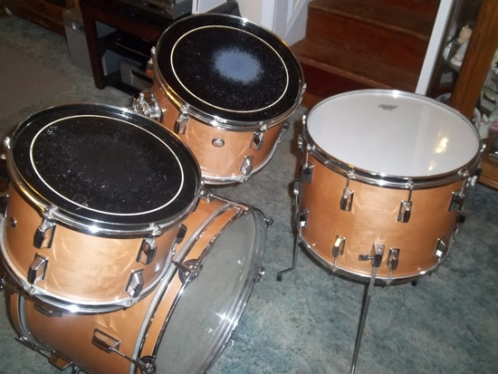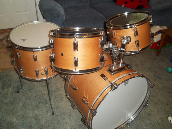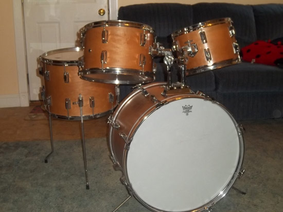 Rescued the 22/13/12 from a garage in SE Kansas. Originally blue sparkle but has some serious fading (which originally I thought was just a heavy layer of dust that would clean off) and no floor tom, so they got rewrapped in a maple PSA veneer. The floor tom is made from the "remains" of a 12x16 Slingerland TDR marching drum, redrilled for Pearl style lugs to match the rest.