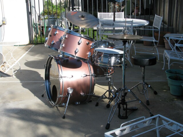 Here's pictures of the two I sold. I stripped and painted the 'copper' kit, the yellow one I cleaned. The one I'm working on now, I stripped and am painting. The copper kit is standard sizes, 22 inch bass, etc... the yellow is a 24 inch bass.