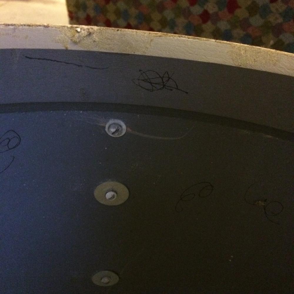 There are some minor blemishes to point out most involving the kick drum. As you can see from the pictures the Rogers badge is missing from the bass drum. The original owner took the badge off for whatever reason. There is also some wrap lift on the kick. There is one screw missing on the rack tom swivo mount plate. Finally there is some pen marks in the kick as seen in the pictures. It looks like either the shop or the original owner wrote the sizes on the inside of the drums, and for whatever reason marked up the bass drum like you see in the pictures. The wrap coloring and condition is clean and vibrant on all 4 drums otherwise.