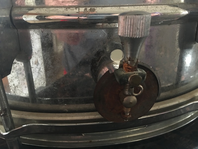 Really cool drum. A fair amount of pitting. The Strainer is jacked (and impossible to find a replacement from what I can tell online) and I am not sure if the hole above the strainer is a factory vent hole or a homemade job. Looks factory but seems like a strange spot for a vent hole. Again Sonor experts please let me know what is up if you can.