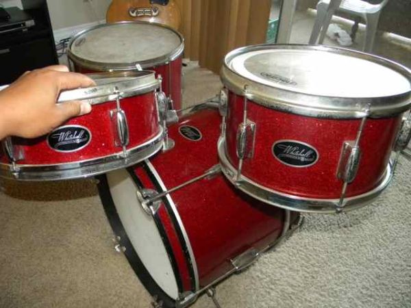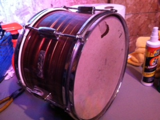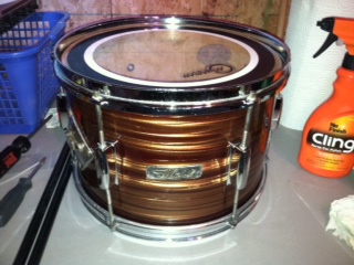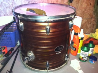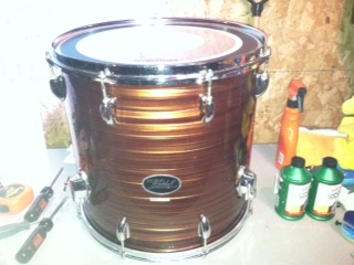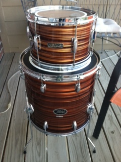 Here are the 16" floor tom and the 12" side tom. I just dismantled and did a deep cleaning and put on new heads and she came back to life! The 20" kick should be done the next few days. The kick and side tom are club date, but the floor tom has a newer badge and standard double lug setup. It also has Pearl floor tom mounts that are factory. I'll post a picture again when the kit is complete!
