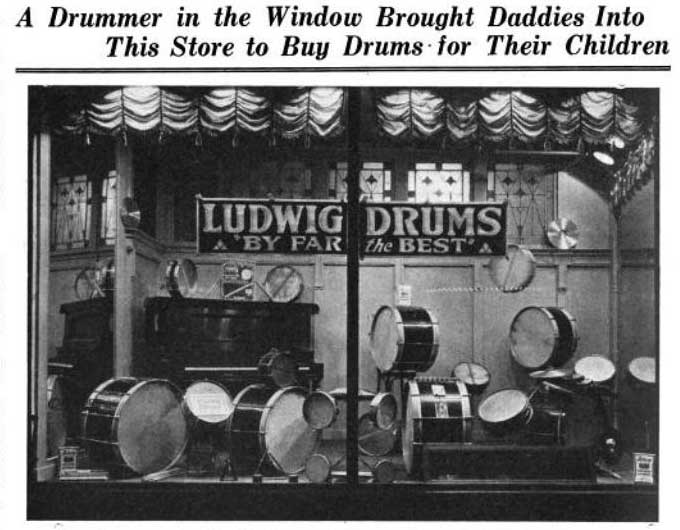 Oh, man! That's really cool! Look at that window! I want drum shops to look like that again! Holy cow is that cool or what? And speaking of holy cow....that was a big calfskin on that bass drum! No......*clears throat*....bull!