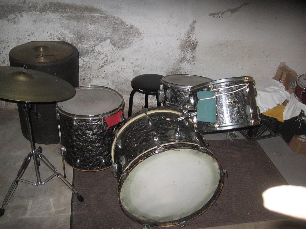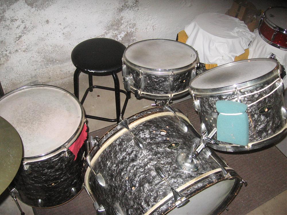 Not in perfect shape by any means, but historically significant nonetheless (for those of us who care, anyway.) Original heads on both sides of the snare drum, original heads both sides of the rack tom, 1 head/hoop missing on the floor tom, bass drum heads both look original.